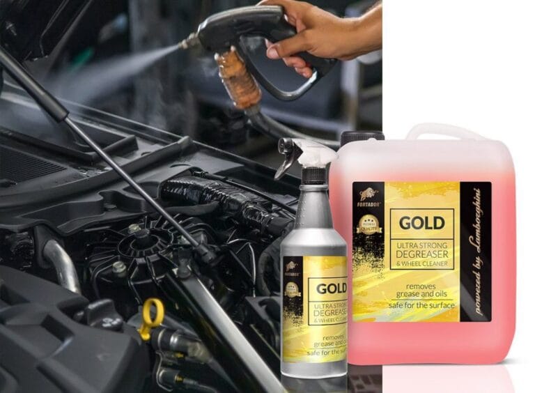 GOLD DEGREASER – concentrate. Use in a ratio of 1:20 with water. Do not pour it into the machine, use it only externally. It can be used directly from the atomizer to a heavily soiled surface. It is excellent for cleaning rims in the car too. It is enough to apply a small amount of the product to the rim. Just wait a maximum of 2 minutes and clean it with steam. An ideal solution for removing strong industrial dirt.
